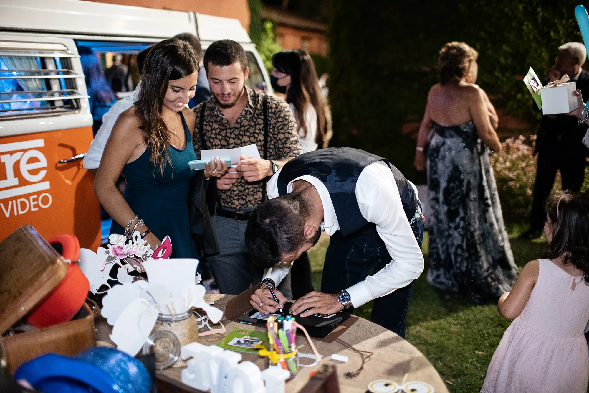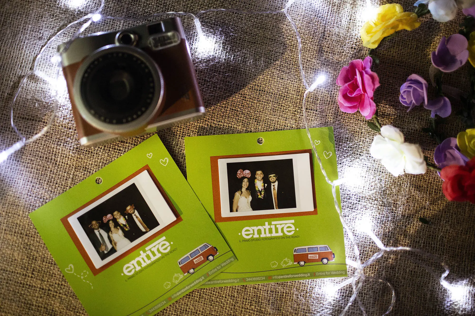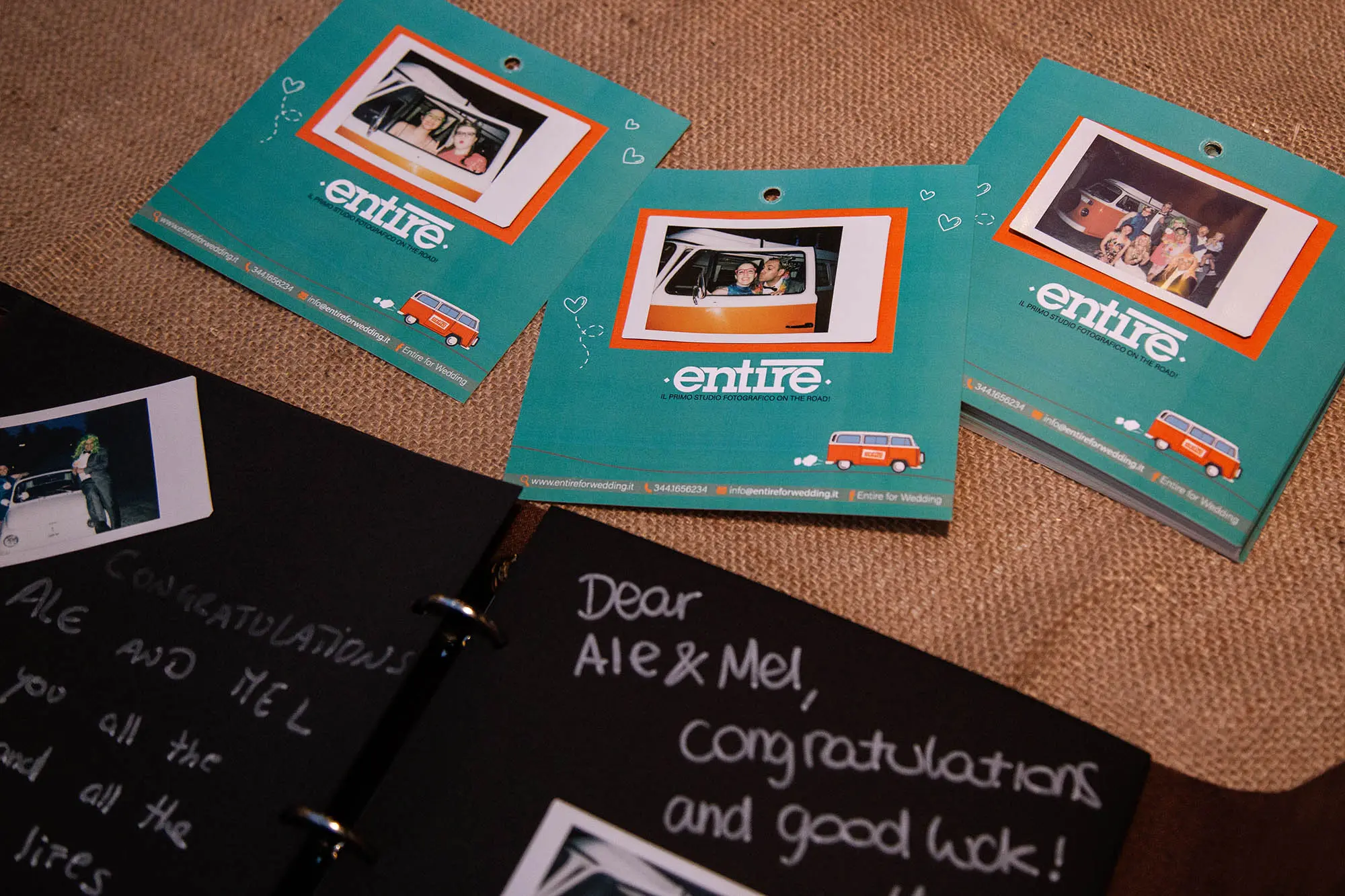 Nel corso degli anni ci siamo accorti che se lasciato al caso oppure se non seguito da nessuno, il Photobooth non viene sfruttato, qualche invitato magari è più timido oppure al contrario viene monopolizzato da qualche gruppo di amici. Per questo motivo abbiamo una persona dedicata con una polaroid e di ogni situazione verranno scattate due foto, una verrà applicata su un cartoncino con una grafica simpatica e personalizzata del Furgoncino Entire e l’altra copia andrà in un Guestbook , che a fine giornata vi verrà consegnato, con all’interno, oltre le foto scattate durante il ricevimento, tutte le dediche lasciate dai vostri ospiti.