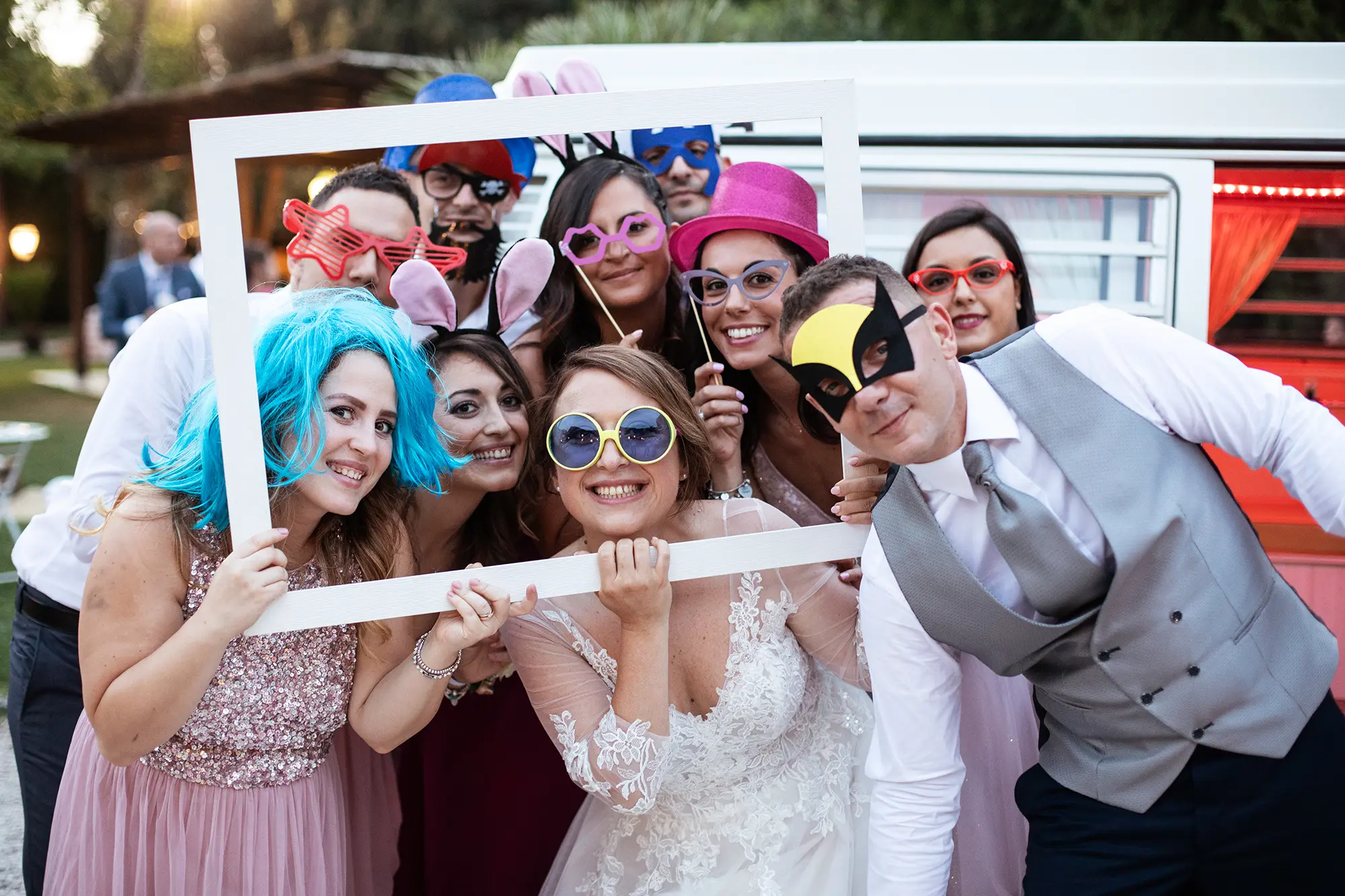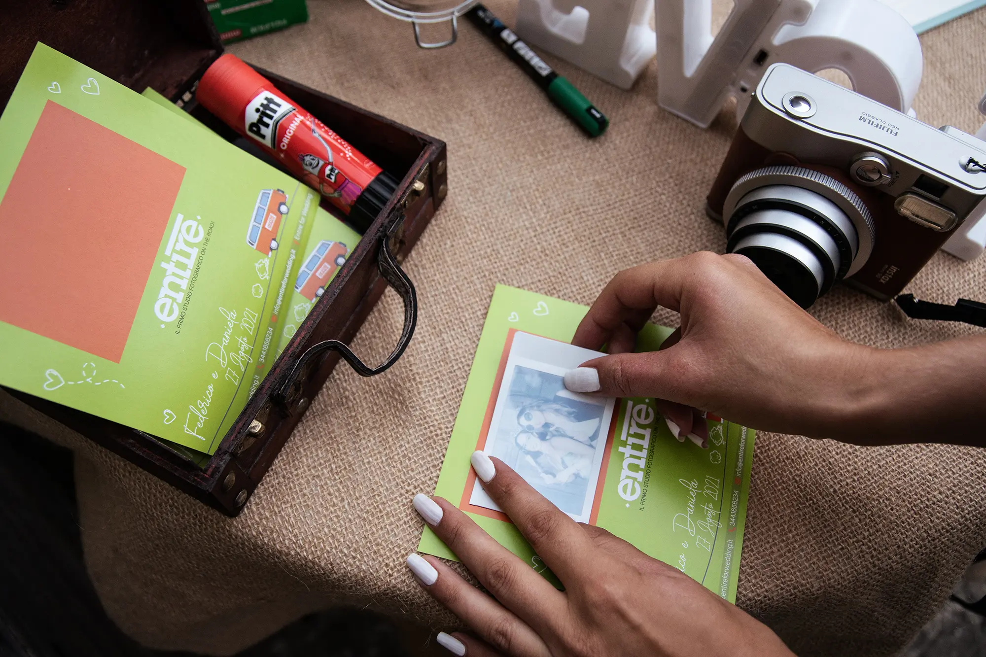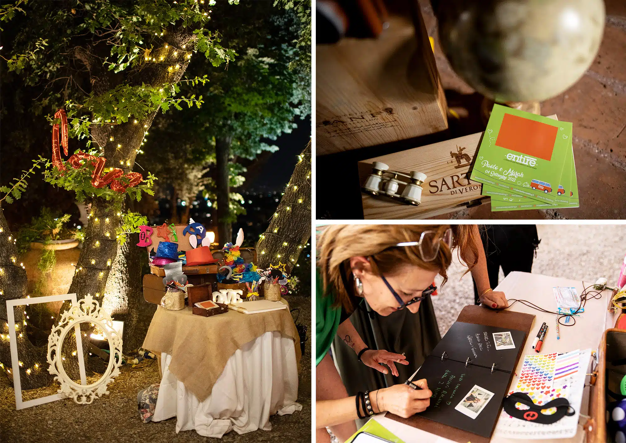 Nel corso degli anni ci siamo accorti che se lasciato al caso oppure se non seguito da nessuno, il Photobooth non viene sfruttato, qualche invitato magari è più timido oppure al contrario viene monopolizzato da qualche gruppo di amici. Per questo motivo abbiamo una persona dedicata con una polaroid e di ogni situazione verranno scattate due foto, una verrà applicata su un cartoncino con una grafica simpatica e personalizzata del Furgoncino Entire e l’altra copia andrà in un Guestbook , che a fine giornata vi verrà consegnato, con all’interno, oltre le foto scattate durante il ricevimento, tutte le dediche lasciate dai vostri ospiti.